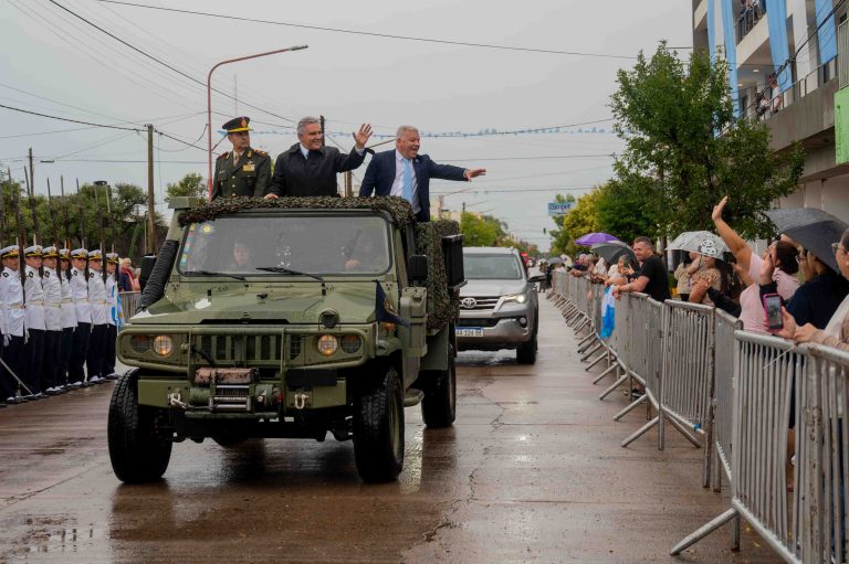 Cerca de las 11.30, el gobernador y el intendente llegaron al sector del acto a bordo de un vehículo militar, desde donde saludaron a los vecinos presentes.