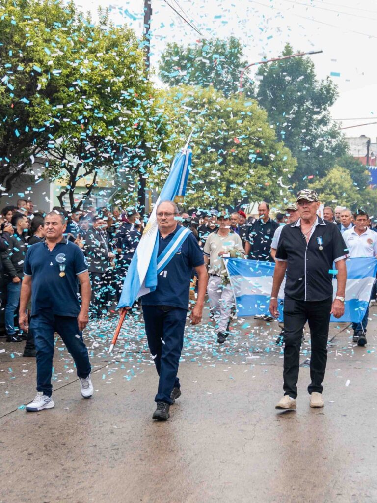 Entre los protagonistas de la jornada estuvieron los veteranos de Malvinas, provenientes de Arroyito y de distintos puntos de la región y la provincia. Su paso por el desfile fue acompañado por aplausos y muestras de reconocimiento del público, en uno de los momentos más emotivos del acto.